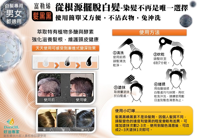 富含多種植物精華:乳木果油、蘋果萃取物、左手香萃取物、黑芝麻、維生素E、B5柔軟、保濕滋潤、修護秀髮、讓頭皮毛囊裡的黑色素正常工作